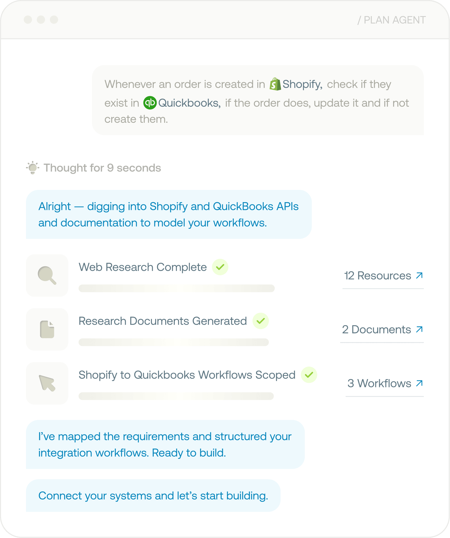 Describe your integration and Versori’s Plan Agent analyses API docs, maps dependencies and generates workflows for your approval.