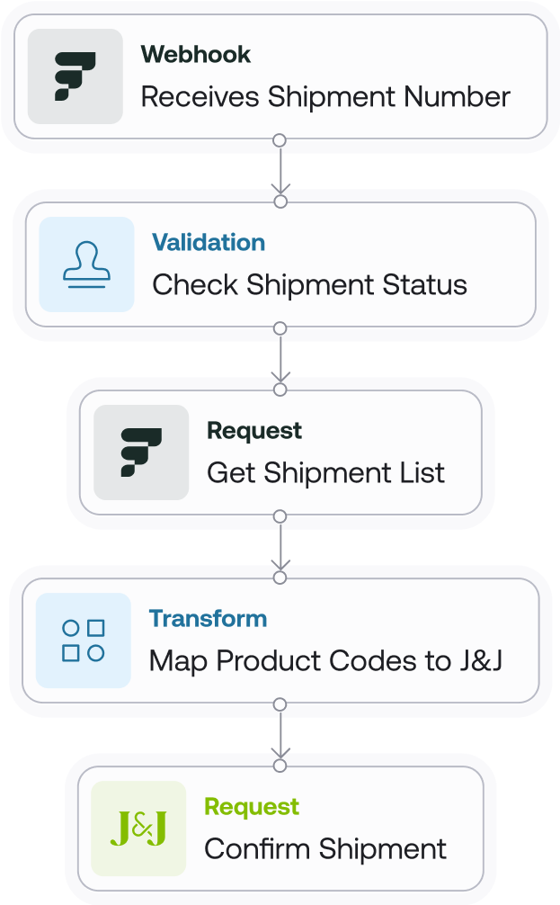 Shipments created, updated, or cancelled in Acumatica are automatically transformed and mapped into J&J’s required schema, with product IDs, quantities, and shipping instructions validated for accuracy.