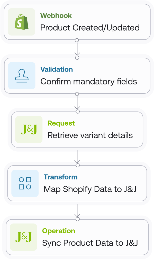 Product data syncs in real time, orders push straight to J&J for fulfilment, and inventory updates flow back automatically.